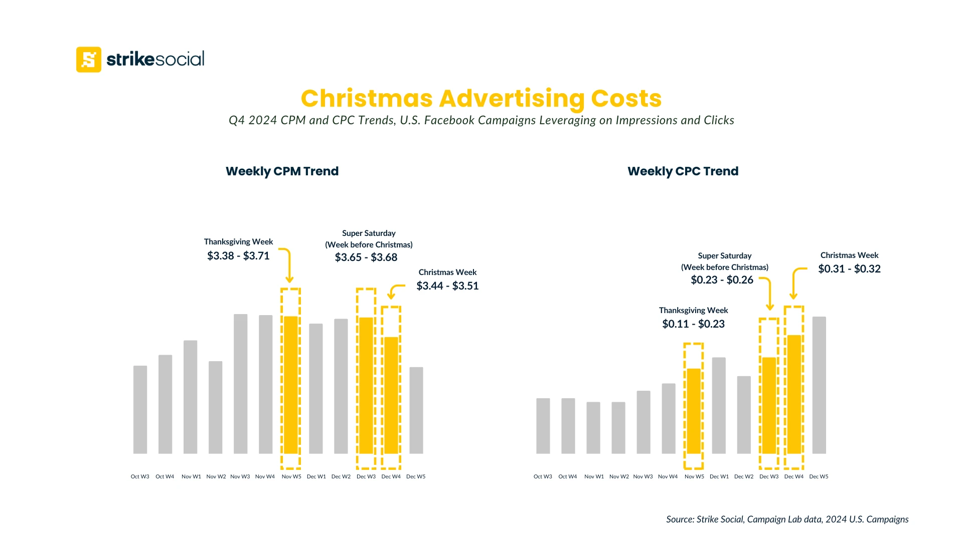 - Notice that on Facebook, CPCs continue to rise and actually peak during Christmas Week. This suggests that while users are still active, they are fatigued or less likely to click off-platform as the holiday approaches, driving up the cost of traffic exactly when shipping cutoffs are imminent.