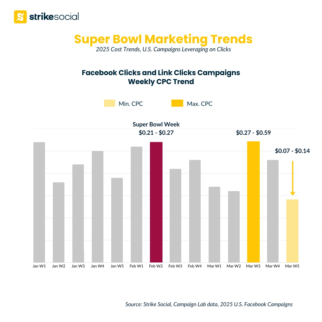 If you plan to drive Facebook audiences to click campaigns during Super Bowl week, launch in advance to take advantage of lower CPCs and build momentum leading into the game. This pre-game kickoff also allows you to craft content tailored to both sports fans and casual audiences, thereby increasing engagement before the Super Bowl even begins.